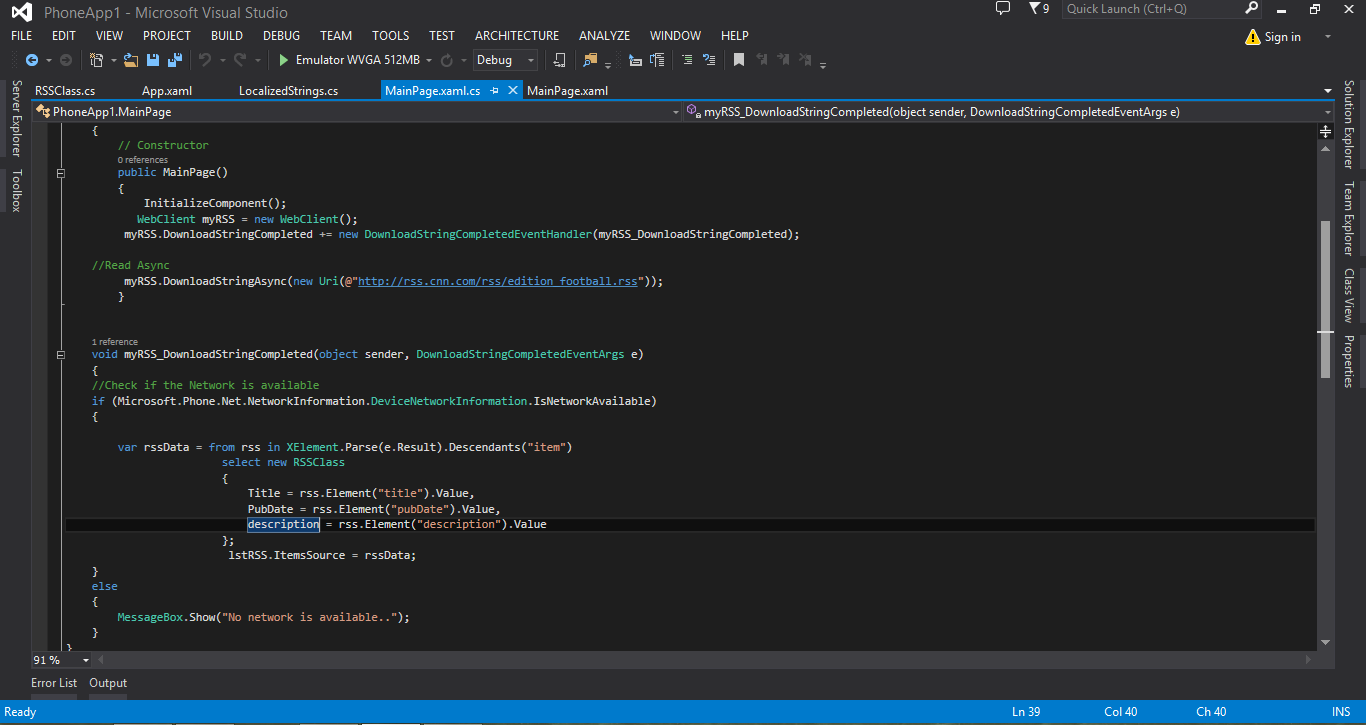 Now lets move to the main page.cs. Here the real code is written. First we have created an object of web-client. Below that it's creating new classes. Where the button is as a parameter is given.Below that you will find a code that will go to the website as we are here using the BBC RSS feeds it will fetch xml code and in the button bellow the the code is parsed. You will find a condition
